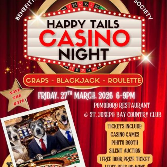 Roll the dice for a great cause at Happy Tails Casino Night, benefitting the St. Joseph Bay Humane Society! Enjoy a glamorous evening of fun and fundraising with exciting games, delicious bites, and plenty of chances to win.